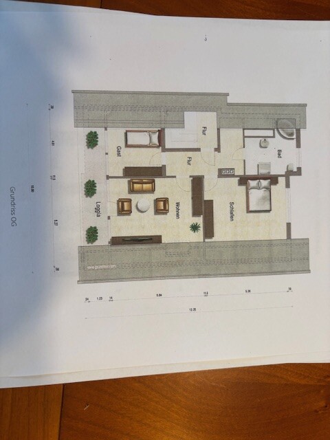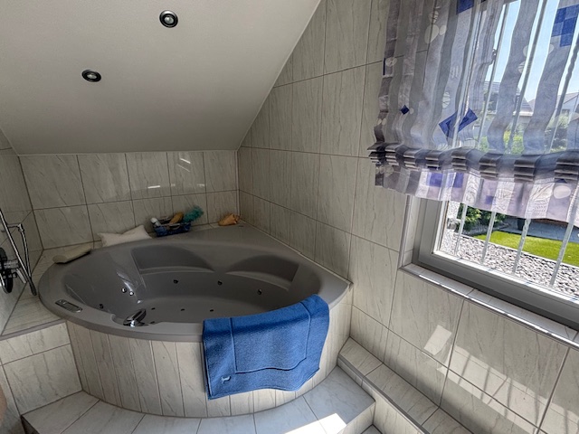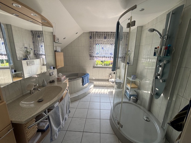 Im Obergeschoss befinden sich 1 Diele, 3 weitere Zimmer ( eins mit Küchenanschluss), sowie 1 Balkon, 1 Badezimmer mit Dusche und Whirpoolwanne.