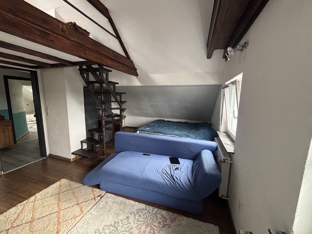 Die Wohnung im Dachgeschoss ( 64 m²) bietet durch die Balken und Schrägen eine gemütliche Atmosphäre. Diese Einheit ist mit drei Zimmern, einer sehr großen Wohnküche und einem Badezimmer ausgestattet.
