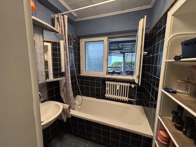 Die Wohnung im Erdgeschoss ( 85m²) ist mit einem großen, hellen Wohnzimmer mit Zugang zur Terrasse, zwei weiteren Zimmern, sowie einer große Küche und einem Badezimmer ausgestattet.